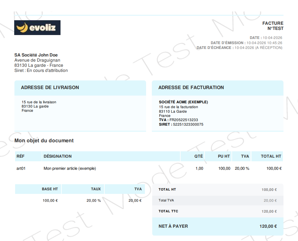 Pour des raisons de mise en conformité avec la NF203, tous les PDF des documents créés en période d’essai sur Evoliz sont marqués d’un filigrane “Mode test” et portent un numéro temporaire (par exemple, Facture n°TEST) :