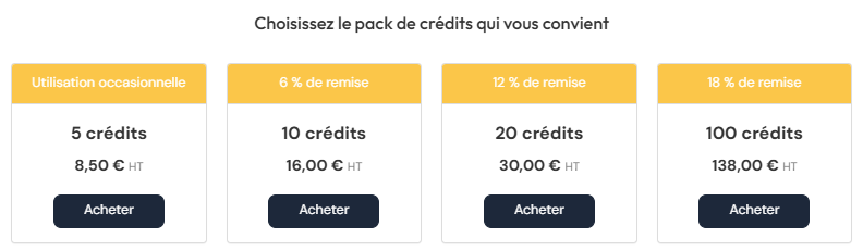 Pour acheter des crédits, connectez-vous à votre compte, puis cliquez sur votre Nom Prénom en bas à gauche > Crédits.