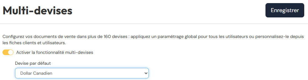 Le multi-devises permet uniquement d'éditer des documents dans une autre devise. Le paramétrage du logiciel, les rapports ainsi que les indicateurs de votre tableau de Bord resteront en Euro.