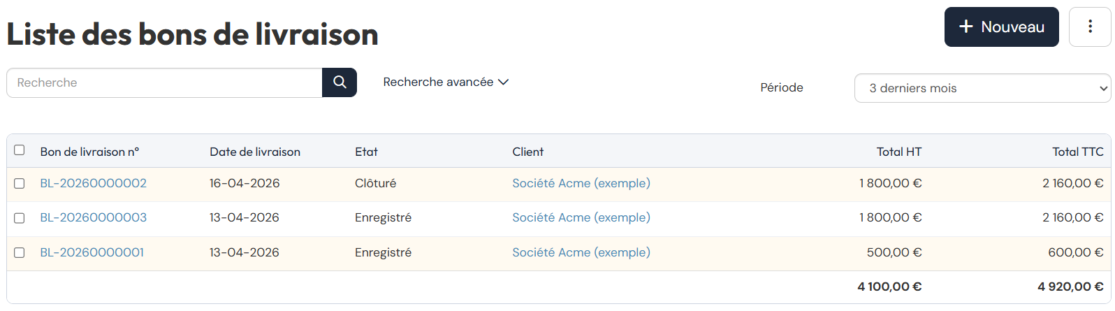 Pour créer un bon de livraison sur evoliz, rendez-vous dans votre menu latéral de gauche > Ventes > Bons de livraison. Cliquez sur + Nouveau en haut à droite :