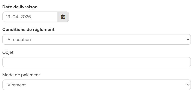 Concentrez-vous ensuite sur la partie gauche de votre écran de saisie. Vous y trouverez la Date de livraison et les Conditions de règlement, qui sont des champs obligatoires. Vous pouvez également personnaliser un Objet pour rendre votre document plus clair pour votre client, et préciser un Mode de paiement :