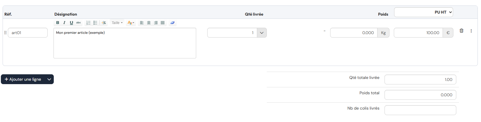 - Poids : ce champ doit correspondre au total de la ligne, et non au détail par Qté livrée (exemple : si vous avez une ligne avec 2 en quantité et que chaque unité pèse 5 Kg, mettez directement 10Kg dans le champ Poids)