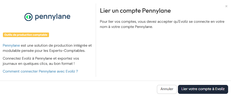 Activer le connecteur Pennylane, puis cliquez ensuite sur Lier votre compte à evoliz.